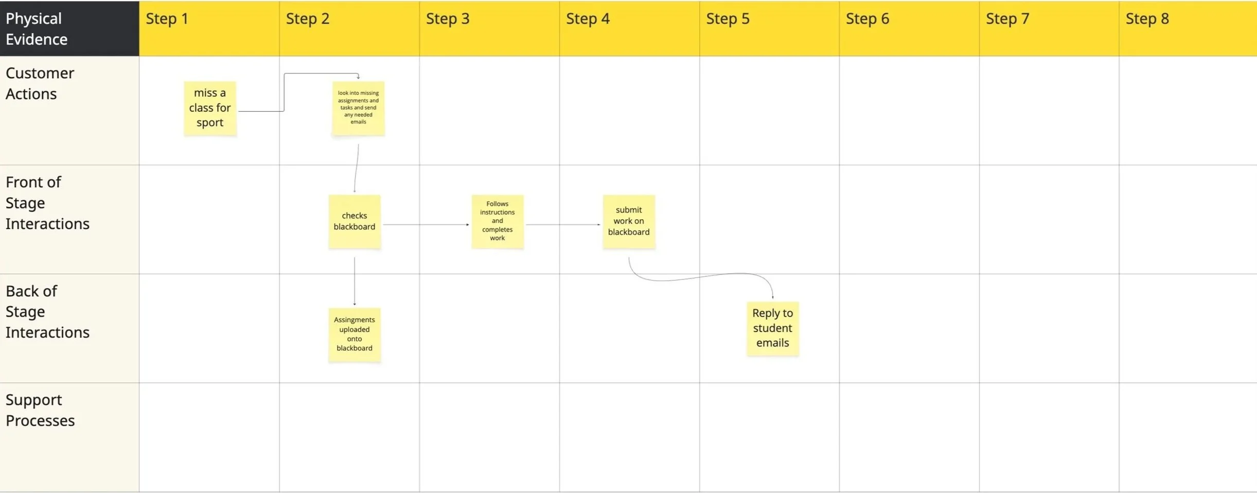 After analyzing our research, we decided to user map our user’s experience in three different ways. The first user map we created is a service blueprint. In this service blueprint we mapped out the journey of a student-athlete missing a class for their sport and then the steps they would take to make up the work.